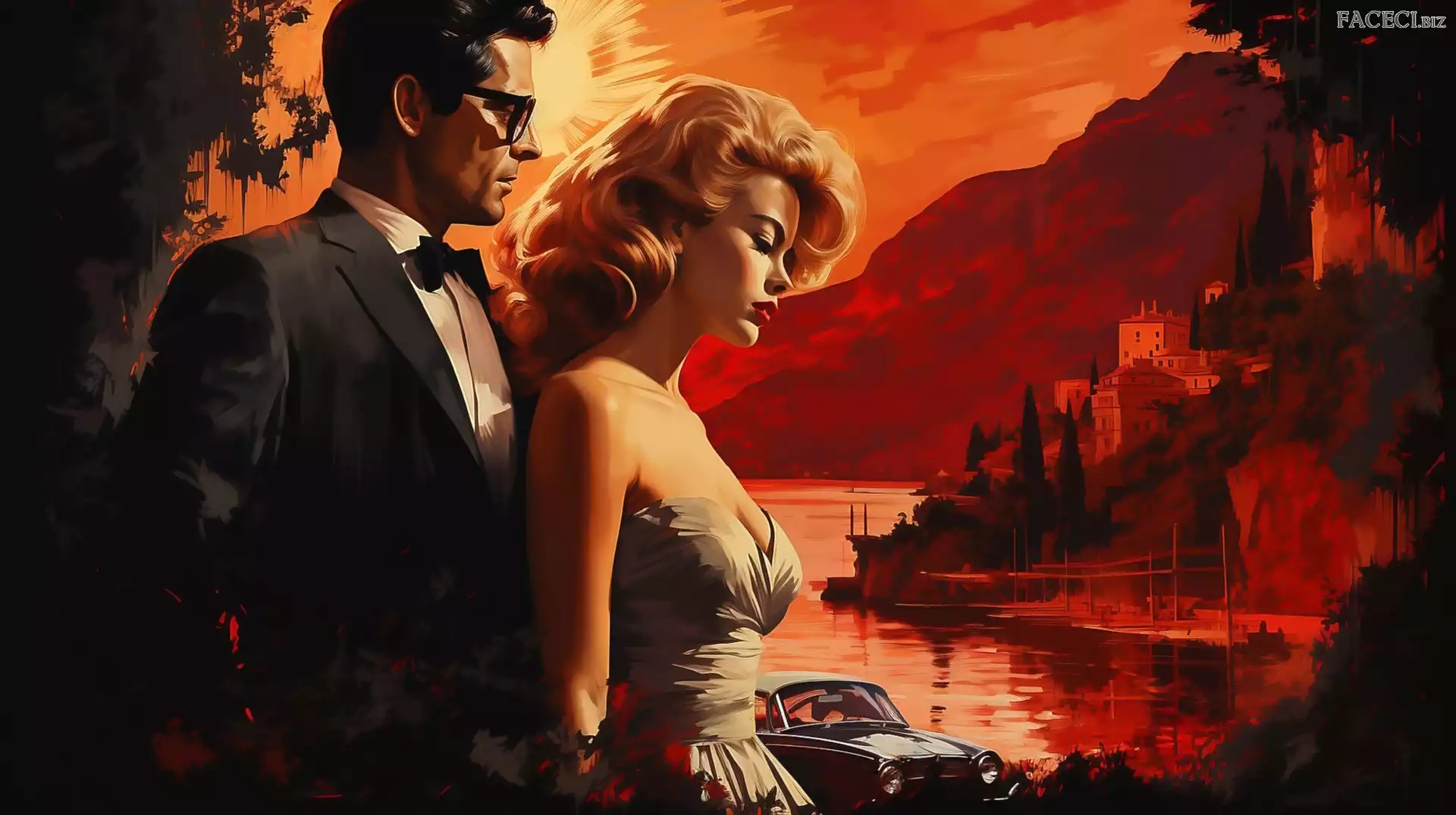 Góry Zachód słońca, Jezioro, Grafika, Kobieta, Mężczyzna - faceci.biz